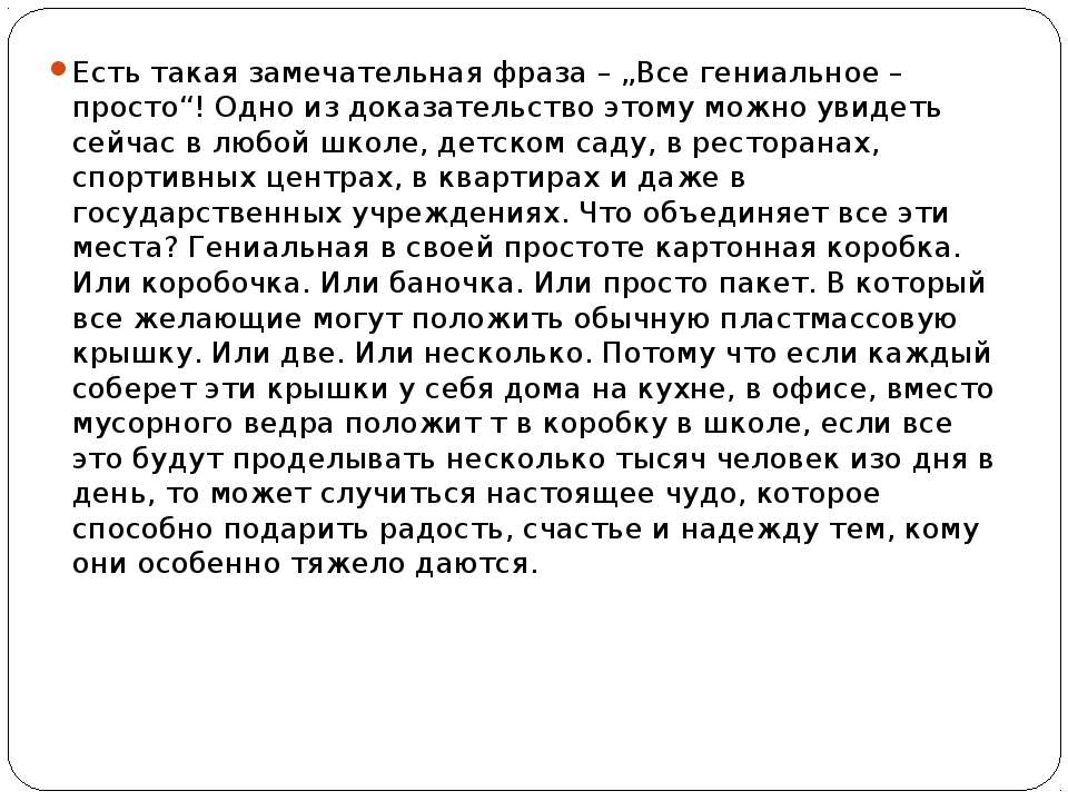 Текст слайда: Есть такая замечательная фраза – „Все гениальное – просто“! Одно из доказательство этому можно увидеть сейчас в любой школе, детском саду, в ресторанах, спортивных центрах, в квартирах и даже в государственных учреждениях. Что объединяет все эти места? Гениальная в своей простоте картонная коробка. Или коробочка. Или баночка. Или просто пакет. В который все желающие могут положить обычную пластмассовую крышку. Или две. Или несколько. Потому что если каждый соберет эти крышки у себя дома на кухне, в офисе, вместо мусорного ведра положит т в коробку в школе, если все это будут проделывать несколько тысяч человек изо дня в день, то может случиться настоящее чудо, которое способно подарить радость, счастье и надежду тем, кому они особенно тяжело даются.