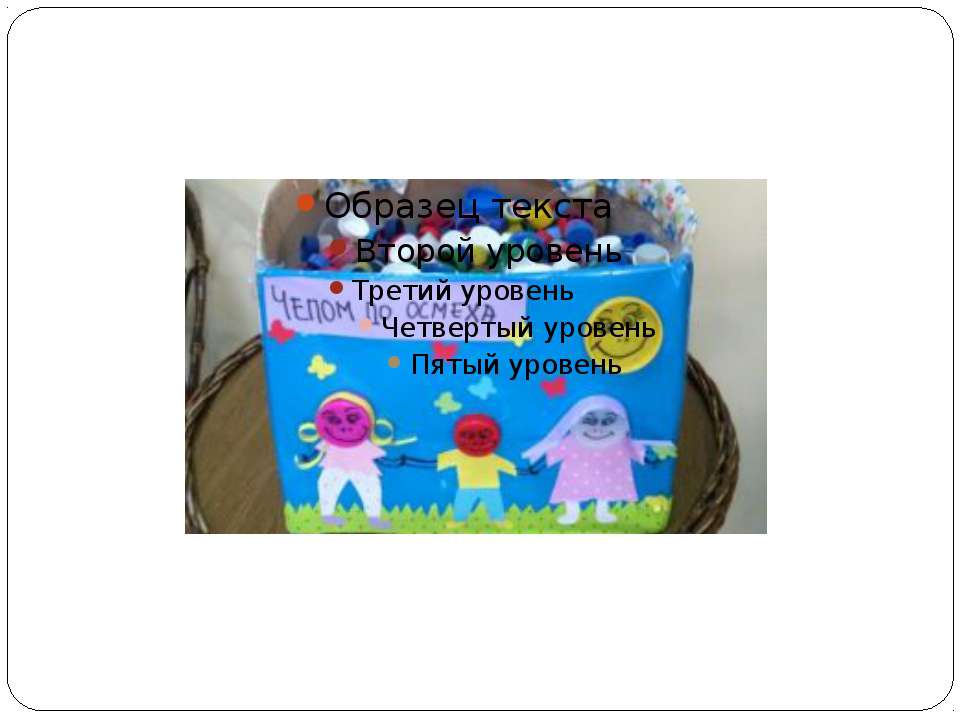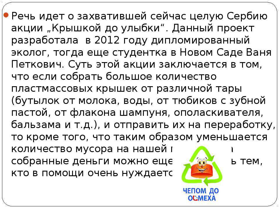 Текст слайда: Речь идет о захватившей сейчас целую Сербию акции „Крышкой до улыбки“. Данный проект разработала в 2012 году дипломированный эколог, тогда еще студентка в Новом Саде Ваня Петкович. Суть этой акции заключается в том, что если собрать большое количество пластмассовых крышек от различной тары (бутылок от молока, воды, от тюбиков с зубной пастой, от флакона шампуня, ополаскивателя, бальзама и т.д.), и отправить их на переработку, то кроме того, что таким образом уменьшается количество мусора на нашей планете, на собранные деньги можно еще и помогать тем, кто в помощи очень нуждается.