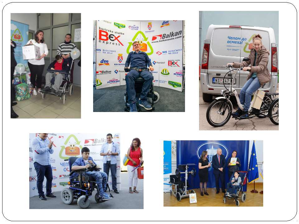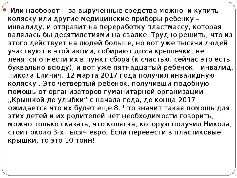 Текст слайда: Или наоборот - за вырученные средства можно и купить коляску или другие медицинские приборы ребенку – инвалиду, и отправит на переработку пластмассу, которая валялась бы десятилетиями на свалке. Трудно решить, что из этого действует на людей больше, но вот уже тысячи людей участвуют в этой акции, собирают дома крышечки, не ленятся отнести их в пункт сбора (к счастью, сейчас это есть буквально всюду), и вот уже пятнадцатый ребенок – инвалид, Никола Еличич, 12 марта 2017 года получил инвалидную коляску . Это четвертый ребенок, получивши подобную помощь от организаторов гуманитарной организации „Крышкой до улыбки“ с начала года, до конца 2017 ожидается что их будет еще 8. Что значит такая помощь для этих детей и их родителей нет необходимости говорить, можно только сказать, что коляска, которую получил Никола, стоит около 3-х тысяч евро. Если перевести в пластиковые крышки, то это 10 тонн!