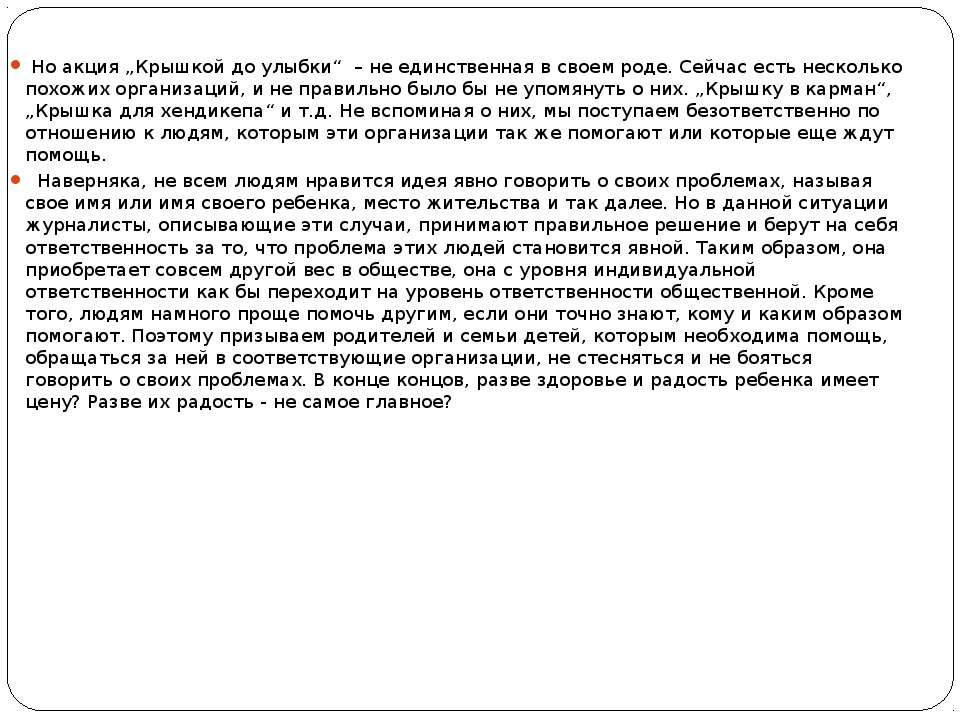 Текст слайда: Но акция „Крышкой до улыбки“ – не единственная в своем роде. Сейчас есть несколько похожих организаций, и не правильно было бы не упомянуть о них. „Крышку в карман“, „Крышка для хендикепа“ и т.д. Не вспоминая о них, мы поступаем безответственно по отношению к людям, которым эти организации так же помогают или которые еще ждут помощь. Наверняка, не всем людям нравится идея явно говорить о своих проблемах, называя свое имя или имя своего ребенка, место жительства и так далее. Но в данной ситуации журналисты, описывающие эти случаи, принимают правильное решение и берут на себя ответственность за то, что проблема этих людей становится явной. Таким образом, она приобретает совсем другой вес в обществе, она с уровня индивидуальной ответственности как бы переходит на уровень ответственности общественной. Кроме того, людям намного проще помочь другим, если они точно знают, кому и каким образом помогают. Поэтому призываем родителей и семьи детей, которым необходима помощь, обращаться за ней в соответствующие организации, не стесняться и не бояться говорить о своих проблемах. В конце концов, разве здоровье и радость ребенка имеет цену? Разве их радость - не самое главное?