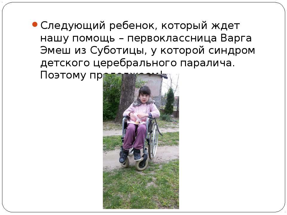 Текст слайда: Следующий ребенок, который ждет нашу помощь – первоклассница Варга Эмеш из Суботицы, у которой синдром детского церебрального паралича. Поэтому продолжаем!