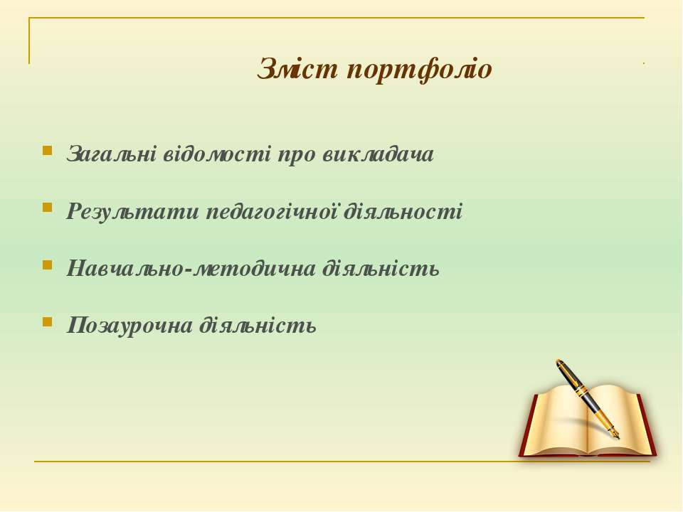 Текст слайда: Зміст портфоліо Загальні відомості про викладача Результати педагогічної діяльності Навчально-методична діяльність Позаурочна діяльність