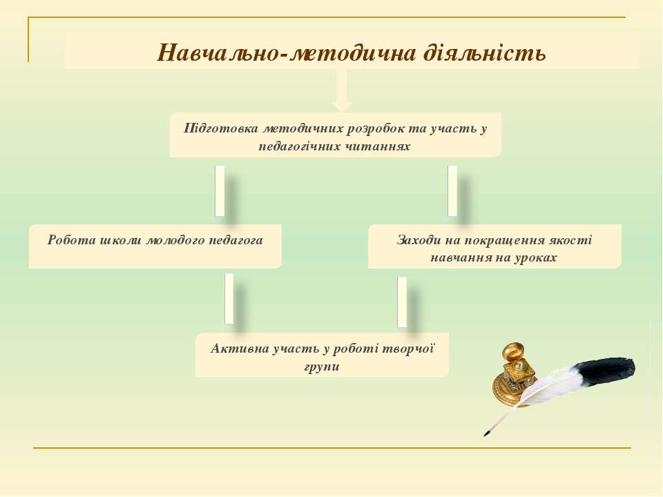 Текст слайда: Робота школи молодого педагога Активна участь у роботі творчої групи Підготовка методичних розробок та участь у педагогічних читаннях Заходи на покращення якості навчання на уроках Навчально-методична діяльність