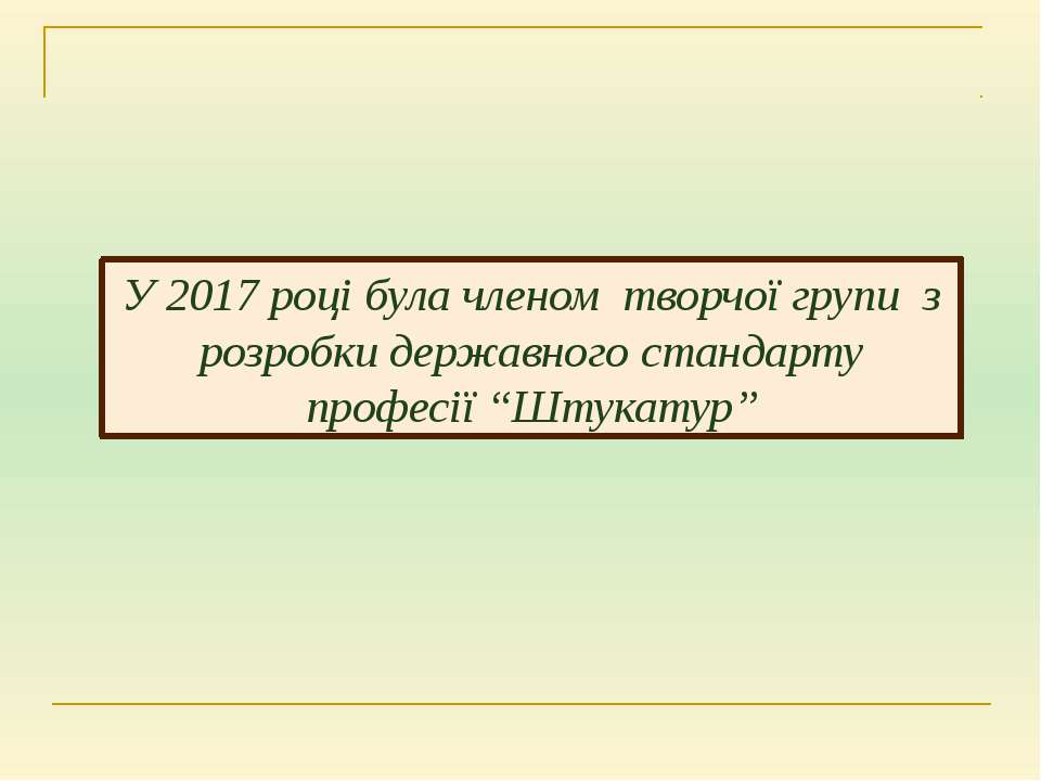 Текст слайда: У 2017 році була членом творчої групи з розробки державного стандарту професії “Штукатур”