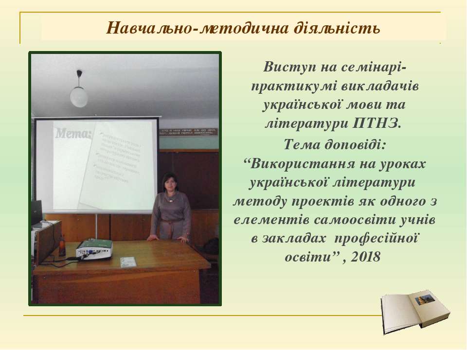 Текст слайда: Виступ на семінарі-практикумі викладачів української мови та літератури ПТНЗ. Тема доповіді: “Використання на уроках української літератури методу проектів як одного з елементів самоосвіти учнів в закладах професійної освіти” , 2018 Навчально-методична діяльність
