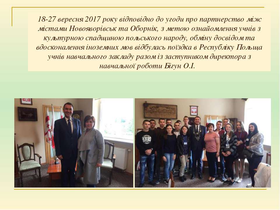 Текст слайда: 18-27 вересня 2017 року відповідно до угоди про партнерство між містами Новояворівськ та Оборнік, з метою ознайомлення учнів з культурною спадщиною польського народу, обміну досвідом та вдосконалення іноземних мов відбулась поїздка в Республіку Польща учнів навчального закладу разом із заступником директора з навчальної роботи Бігун О.І.