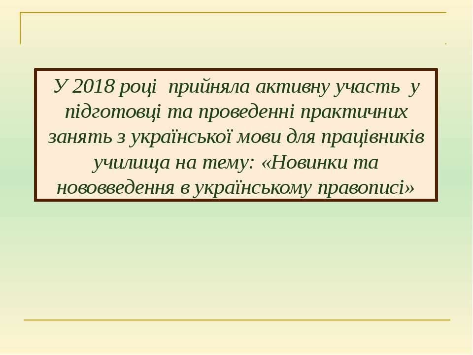 Текст слайда: У 2018 році прийняла активну участь у підготовці та проведенні практичних занять з української мови для працівників училища на тему: «Новинки та нововведення в українському правописі»