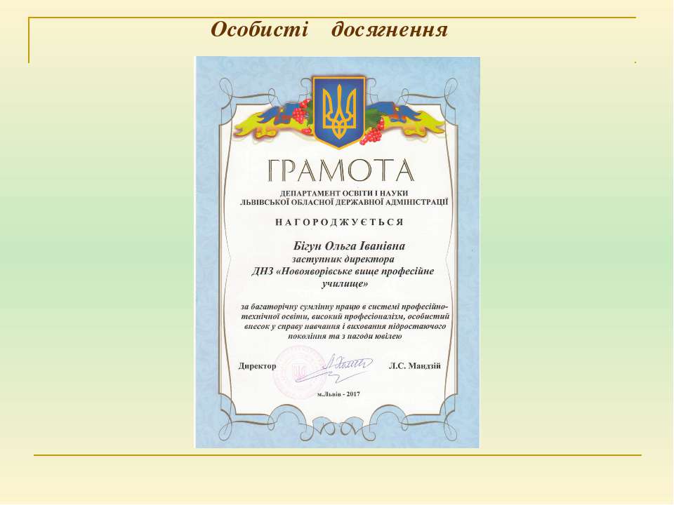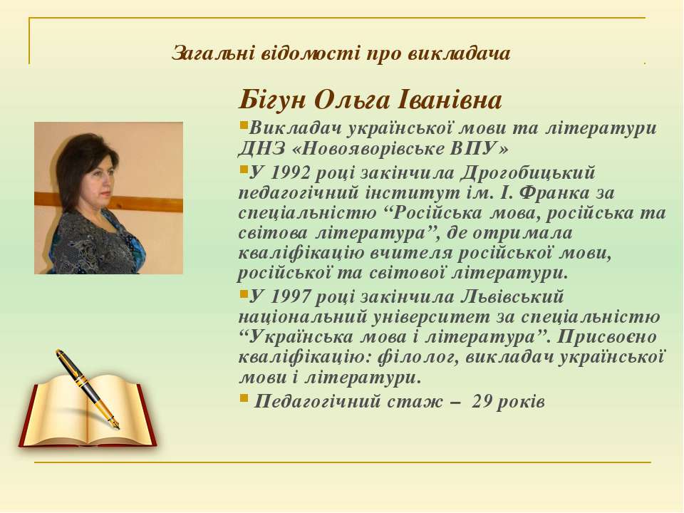 Текст слайда: Загальні відомості про викладача Бігун Ольга Іванівна Викладач української мови та літератури ДНЗ «Новояворівське ВПУ» У 1992 році закінчила Дрогобицький педагогічний інститут ім. І. Франка за спеціальністю “Російська мова, російська та світова література”, де отримала кваліфікацію вчителя російської мови, російської та світової літератури. У 1997 році закінчила Львівський національний університет за спеціальністю “Українська мова і література”. Присвоєно кваліфікацію: філолог, викладач української мови і літератури. Педагогічний стаж – 29 років