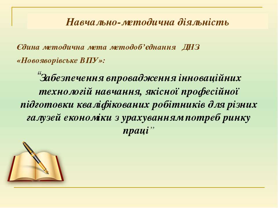 Текст слайда: Єдина методична мета методоб’єднання ДНЗ «Новояворівське ВПУ»: “Забезпечення впровадження інноваційних технологій навчання, якісної професійної підготовки кваліфікованих робітників для різних галузей економіки з урахуванням потреб ринку праці” Навчально-методична діяльність
