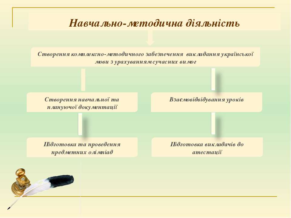 Текст слайда: Навчально-методична діяльність Створення навчальної та плануючої документації Підготовка та проведення предметних олімпіад Створення комплексно-методичного забезпечення викладання української мови з урахуванням сучасних вимог Взаємовідвідування уроків Підготовка викладачів до атестації Навчально-методична діяльність