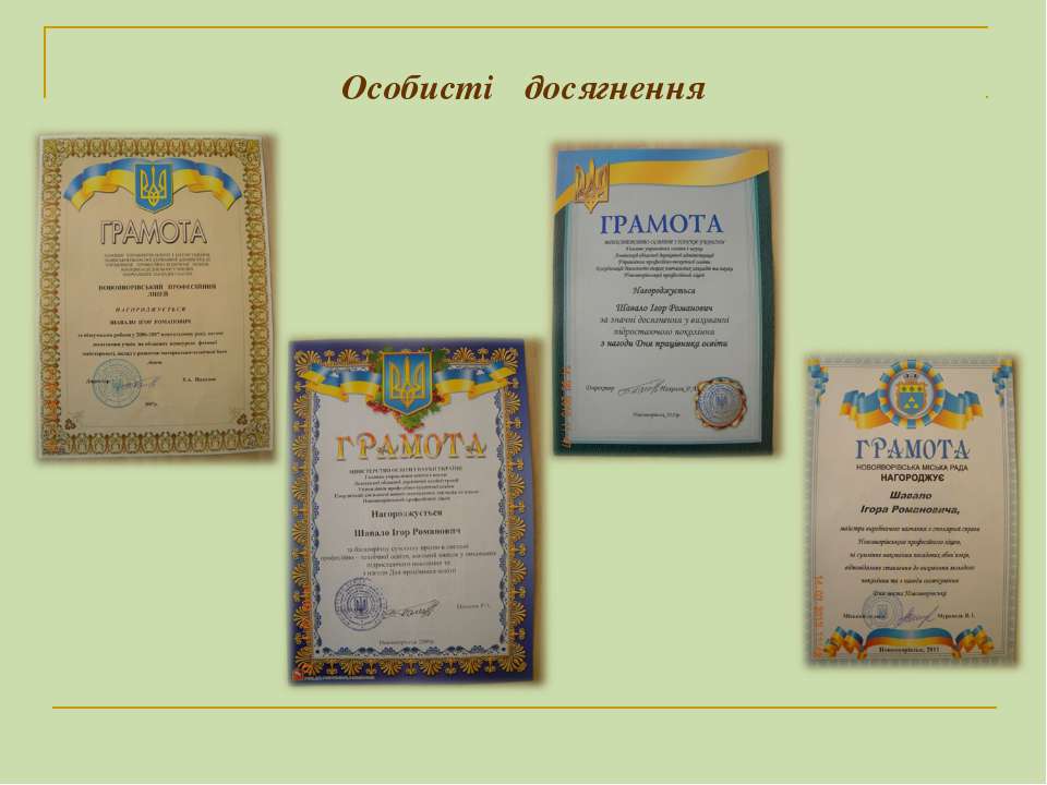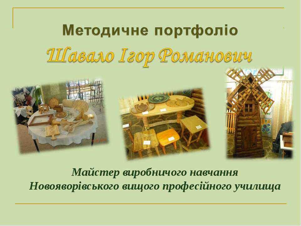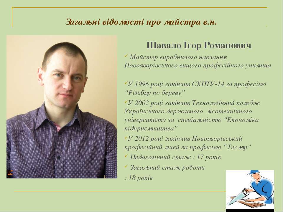 Текст слайда: Загальні відомості про майстра в.н. Шавало Ігор Романович Майстер виробничого навчання Новояворівського вищого професійного училища У 1996 році закінчив СХПТУ-14 за професією “Різьбяр по дереву” У 2002 році закінчив Технологічний коледж Українського державного лісотехнічного університету за спеціальністю “Економіка підприємництва” У 2012 році закінчив Новояворівський професійний ліцей за професією “Тесляр” Педагогічний стаж : 17 років Загальний стаж роботи : 18 років