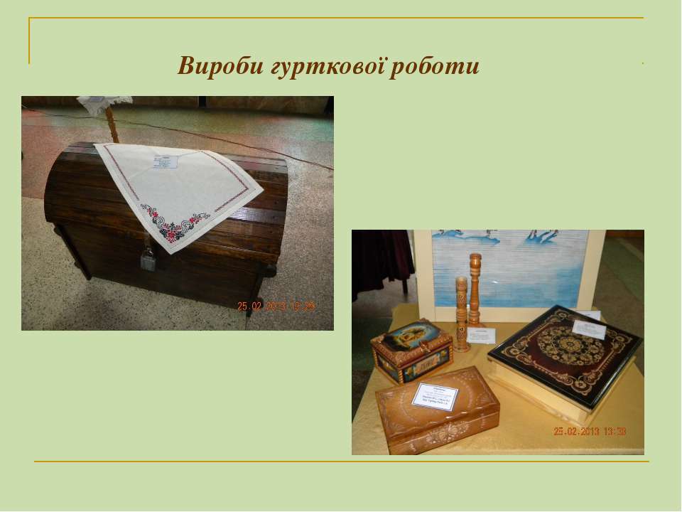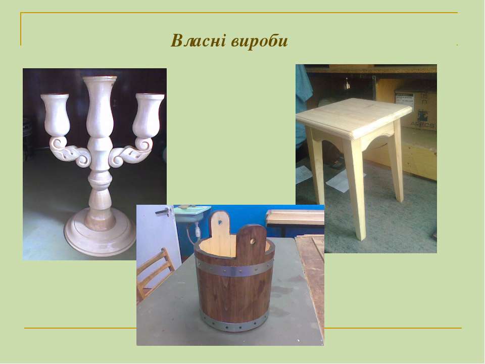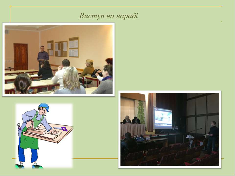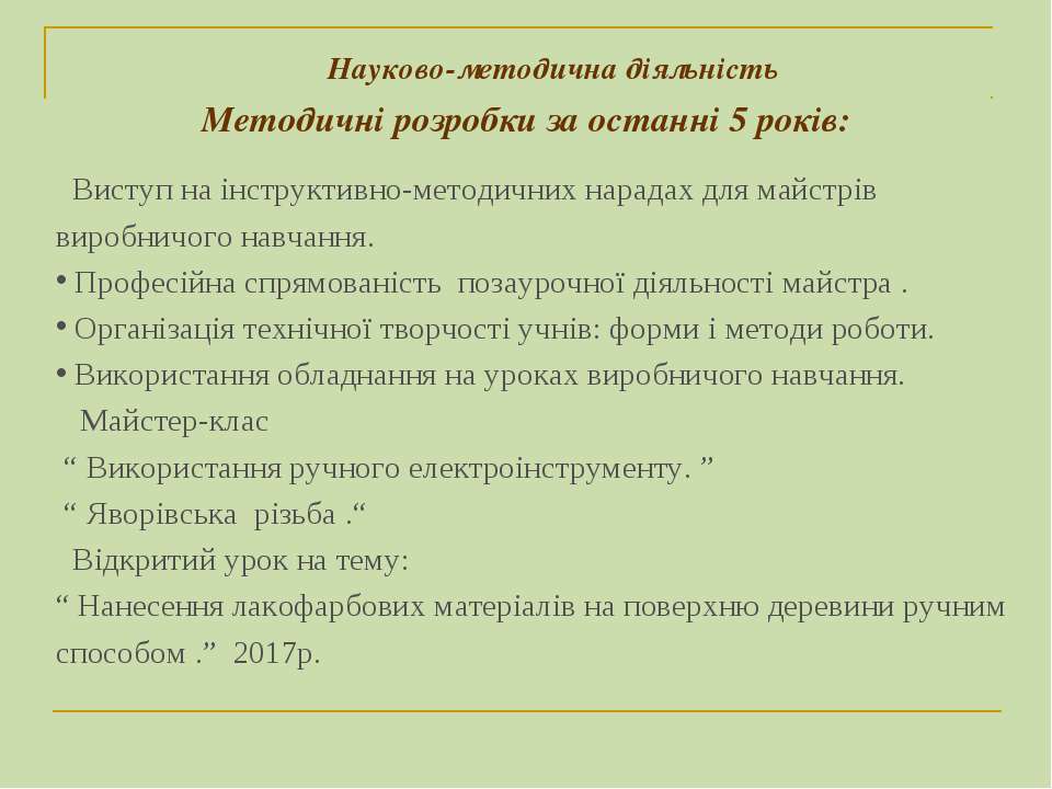 Текст слайда: Науково-методична діяльність Методичні розробки за останні 5 років: Виступ на інструктивно-методичних нарадах для майстрів виробничого навчання. Професійна спрямованість позаурочної діяльності майстра . Організація технічної творчості учнів: форми і методи роботи. Використання обладнання на уроках виробничого навчання. Майстер-клас “ Використання ручного електроінструменту. ” “ Яворівська різьба .“ Відкритий урок на тему: “ Нанесення лакофарбових матеріалів на поверхню деревини ручним способом .” 2017р.