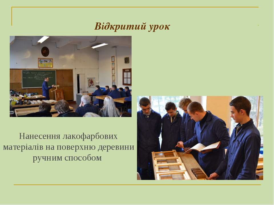 Текст слайда: Відкритий урок Нанесення лакофарбових матеріалів на поверхню деревини ручним способом