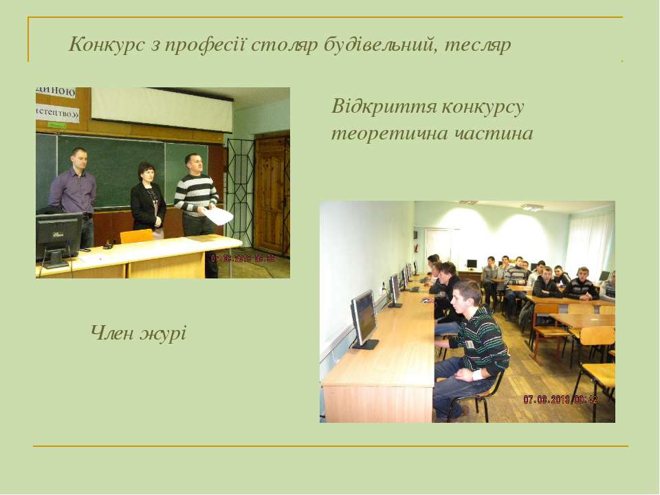 Текст слайда: Конкурс з професії столяр будівельний, тесляр Відкриття конкурсу теоретична частина Член журі