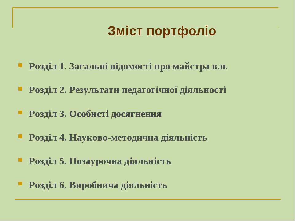 Текст слайда: Зміст портфоліо Розділ 1. Загальні відомості про майстра в.н. Розділ 2. Результати педагогічної діяльності Розділ 3. Особисті досягнення Розділ 4. Науково-методична діяльність Розділ 5. Позаурочна діяльність Розділ 6. Виробнича діяльність