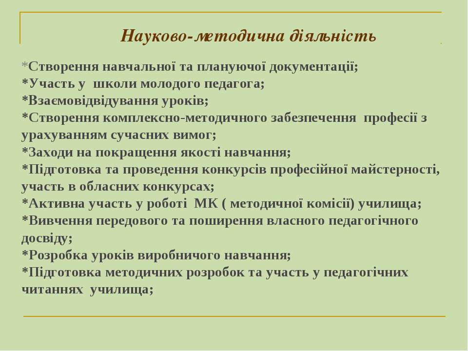 Текст слайда: *Створення навчальної та плануючої документації; *Участь у школи молодого педагога; *Взаємовідвідування уроків; *Створення комплексно-методичного забезпечення професії з урахуванням сучасних вимог; *Заходи на покращення якості навчання; *Підготовка та проведення конкурсів професійної майстерності, участь в обласних конкурсах; *Активна участь у роботі МК ( методичної комісії) училища; *Вивчення передового та поширення власного педагогічного досвіду; *Розробка уроків виробничого навчання; *Підготовка методичних розробок та участь у педагогічних читаннях училища; Науково-методична діяльність